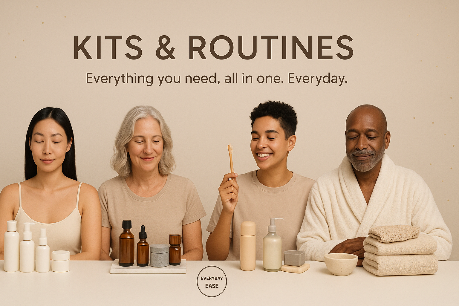 Our Kits & Routines take the guesswork out of self-care. Each bundle is a complete system – whether it’s your 3-step morning skincare or a Sunday spa night ritual.
